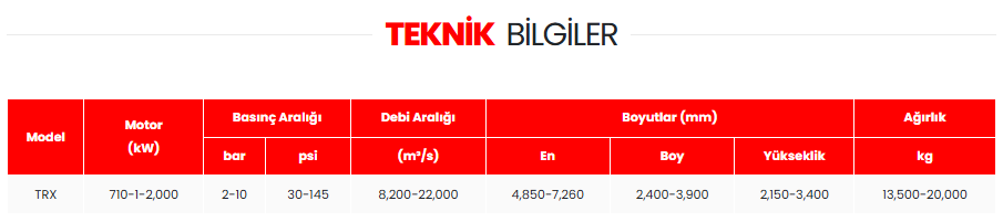 TRX serisi IHI DALGAKIRAN'ın endüstriyel hava santrifüj kompresörleri ürün portföyündeki en büyük modeldir. TRX serisi geniş aerodinamik tasarım seçenekleri, düşük bakım ihtiyacı ve kolay montaj özellikleriyle optimize edilmiş teknik özelliklere sahiptir.